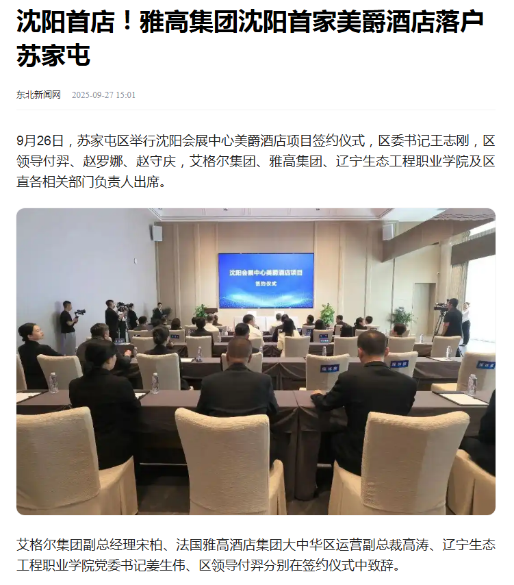 【东北新闻网】沈阳首店!雅高集团沈阳首家美爵酒店落户苏家屯